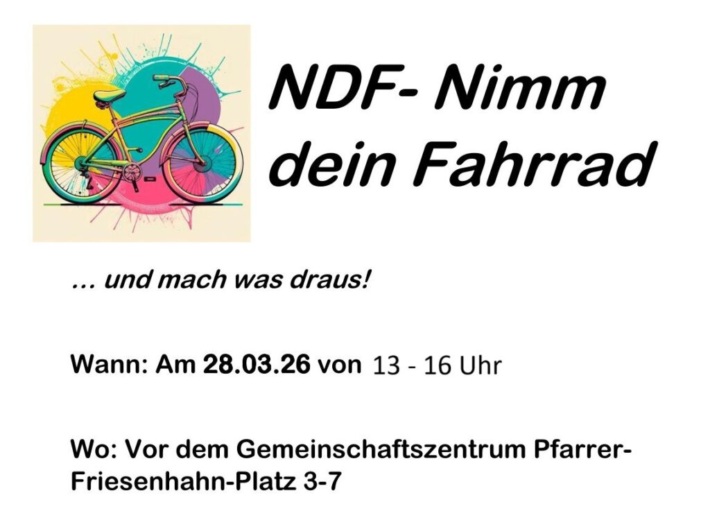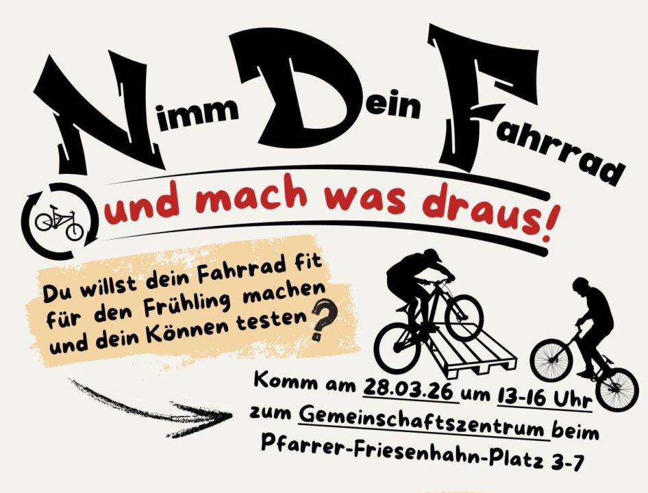 Am 28.03.2026 von 13–16 Uhr laden wir euch herzlich vor das Gemeinschaftszentrum am Pfarrer-Friesenhahn-Platz 3–7 ein. Freut euch auf eine Fahrradwerkstatt für kleine Reparaturen, eine Fahrrad-Waschanlage für neuen Glanz, einen spannenden Parcours zum Ausprobieren eurer Geschicklichkeit und „Pimp my Bike“ zum kreativen Verschönern eures Rads.