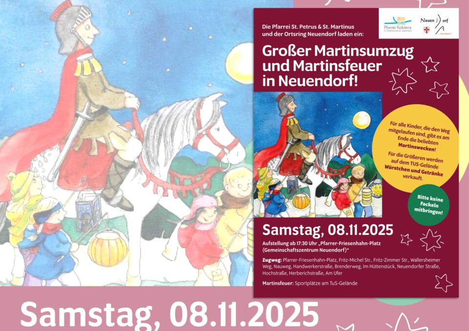Am Samstag, den 8. November 2025, ist es endlich wieder so weit: Ganz Neuendorf leuchtet, wenn der große Martinsumzug durch die Straßen zieht! Kommt zahlreich, bringt eure Laternen, Freunde und Familie mit und erlebt gemeinsam einen stimmungsvollen Abend voller Licht, Musik und Gemeinschaft!