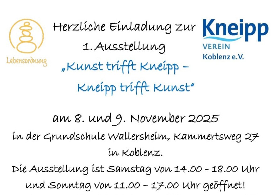 Der Kneipp-Verein Koblenz e.V. lädt alle Kunstinteressierten herzlich zur ersten Ausstellung mit dem Titel „Kunst trifft Kneipp – Kneipp trifft Kunst“ in die Grundschule Wallersheim, Kammertsweg 27, ein. Die Ausstellung ist am Samstag, den 8. November, von 14 bis 18 Uhr sowie am Sonntag, den 9. November, von 11 bis 17 Uhr geöffnet.
