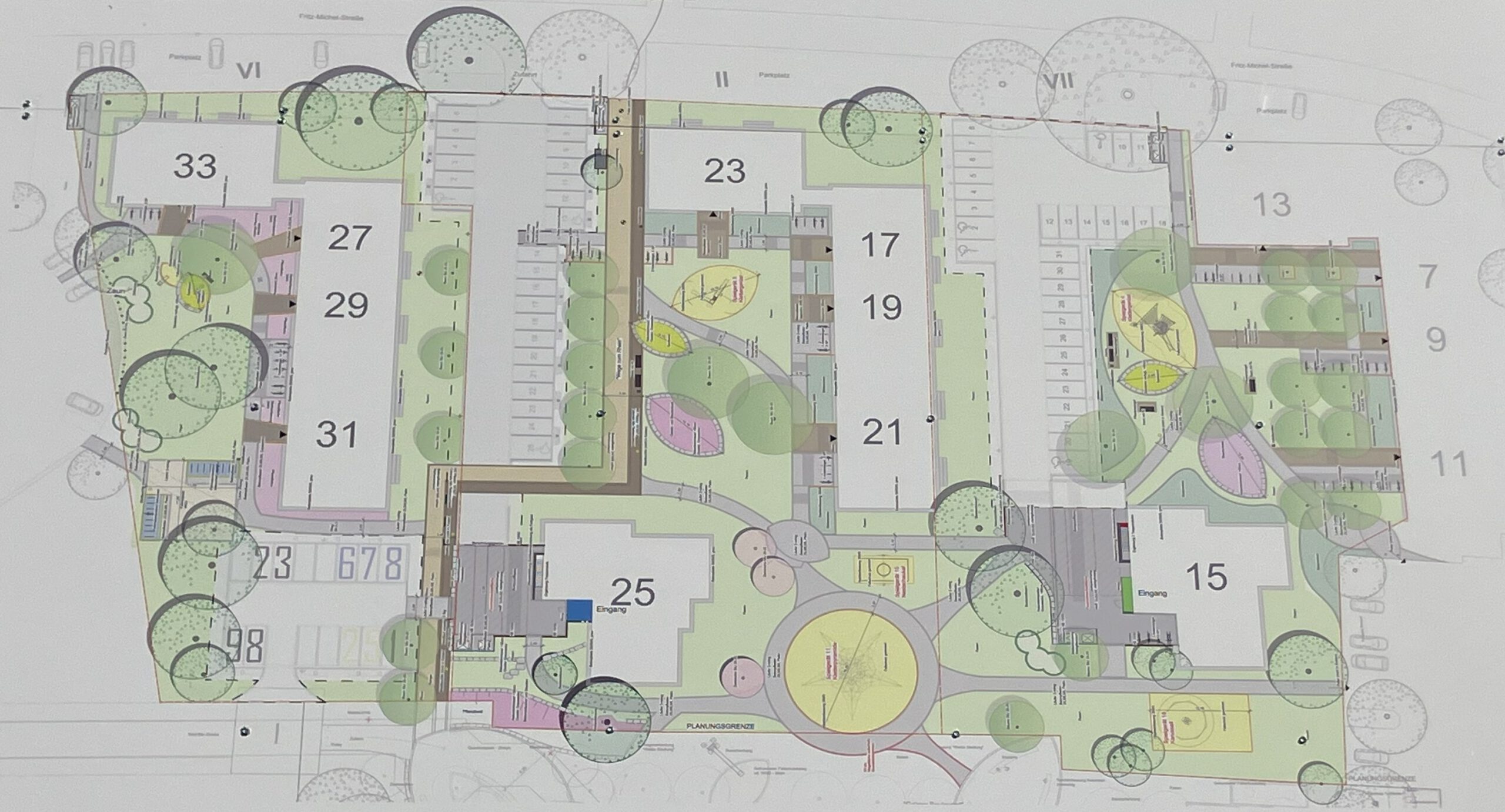 Der erste Bauabschnitt startet im März 2026. Zunächst werden die Freiflächen neugestaltet. Dabei entstehen Grünanlagen, Spielmöglichkeiten für Kinder sowie neue Gehwege, die die Wegeführung im Quartier verbessern. Im Anschluss daran werden die Verkehrsanlagen hergestellt. Hierzu zählen eine neue Feuerwehrzufahrt sowie insgesamt 25 Stellplätze.