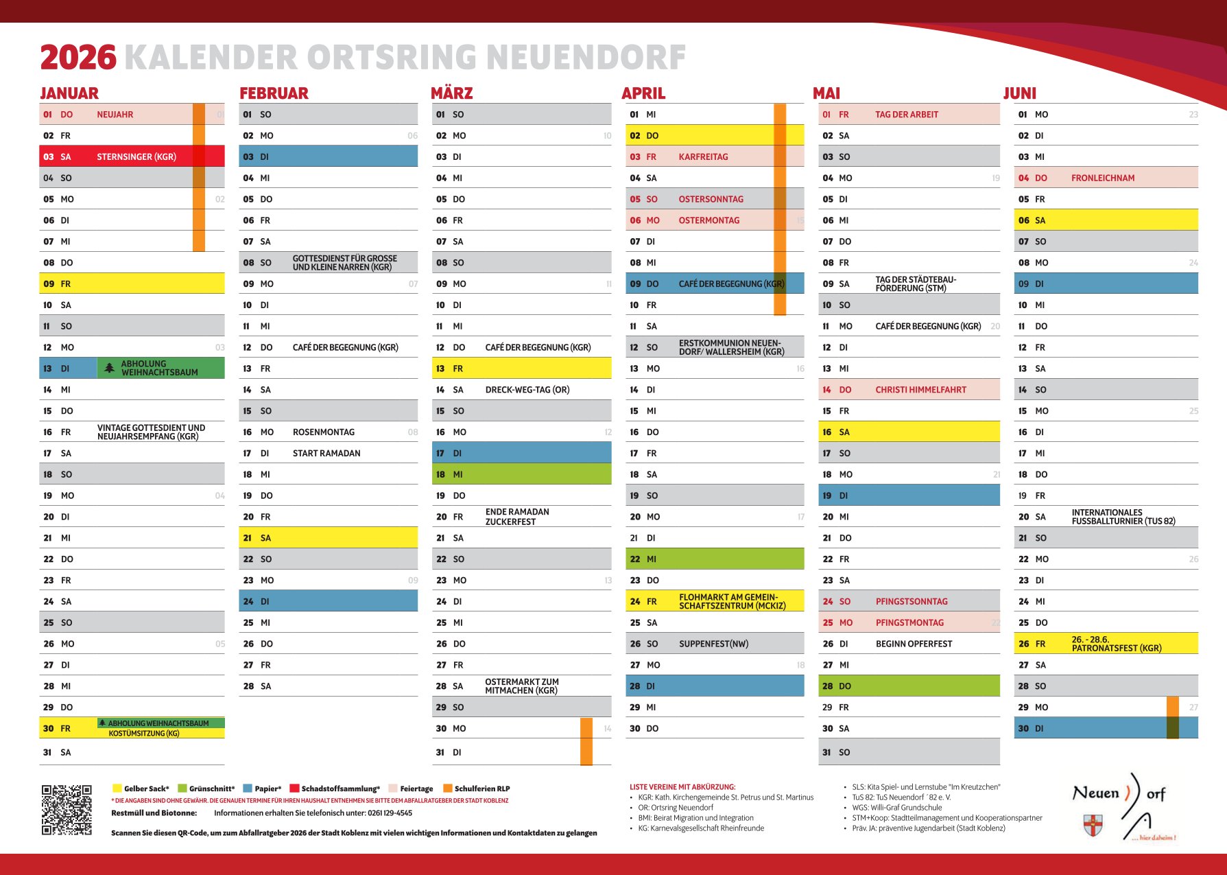 Der Ortsringkalender gibt eine Übersicht über alle wichtigen Veranstaltungen der Neuendorfer Vereine in 2026. Den Kalender im Din A4 Format erhalten Sie bald kostenlos an verschiedenen Anlaufstellen im Stadtteil. Er liegt unter anderem im Gemeinschaftszentrum Neuendorf, den Räumlichkeiten des Kneipp Vereins, bei der Bäckerei Lutz und noch weiteren Stellen im Stadtteil aus.